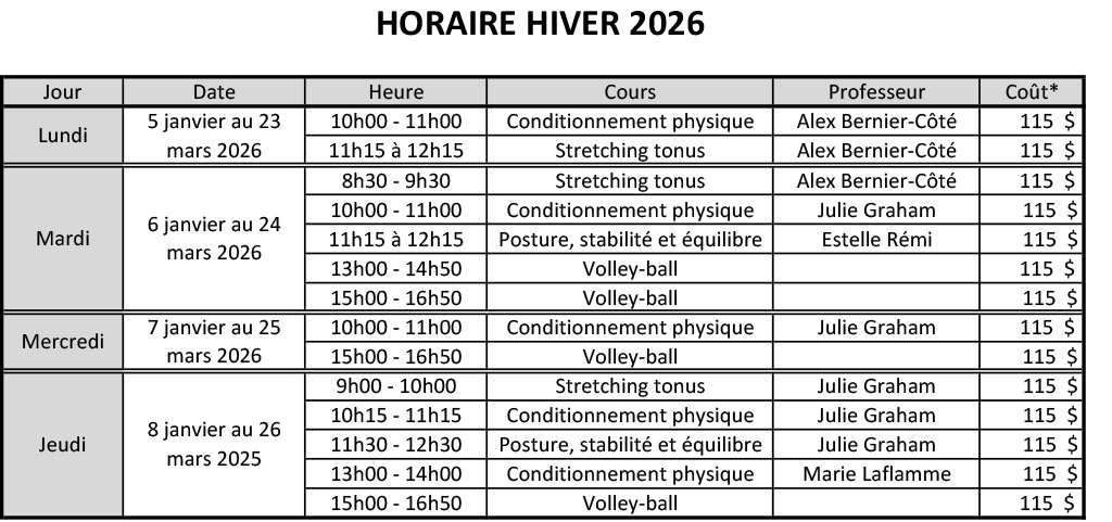 | 5 | Équilibre | Mercredi 13h | 15, 22, 29 janvier et 5 février 2025 | L’atelier visera des exercices pratiques pour améliorer l’équilibre et un survol de plusieurs facteurs pouvant affecter l’équilibre seront vus durant les séances. |